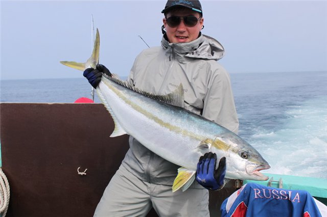 Полный штиль и туман. Температура градусов 20-22. Начинаем рыбачить. Некоторые из рыбаков жалуются, что болят руки. Своим примером показываю, что мы сюда пришли рыбачить, а не валяться в каюте. Первая поклевка не заставила себя долго ждать. По ощущениям очень крупная. Выматывает метров 50-70 плетенки. Начинаю выкачивать. 5-7 минут борьбы и рыба на поверхности. И затем на палубе. Лакедра не крупная, килограмм 10. Но подсек ее ни за рот, а ближе к хвосту. Поэтому и показалось, что на том конце лески достойный соперник. Второй день прошел под лозунгом «Ловит тот, кто рыбачит». Отличился я. Поймал 6 штук. Всего 7. Максимальный вес 16 килограмм.