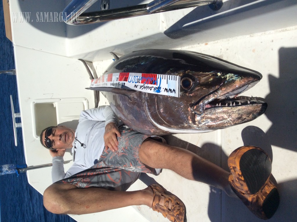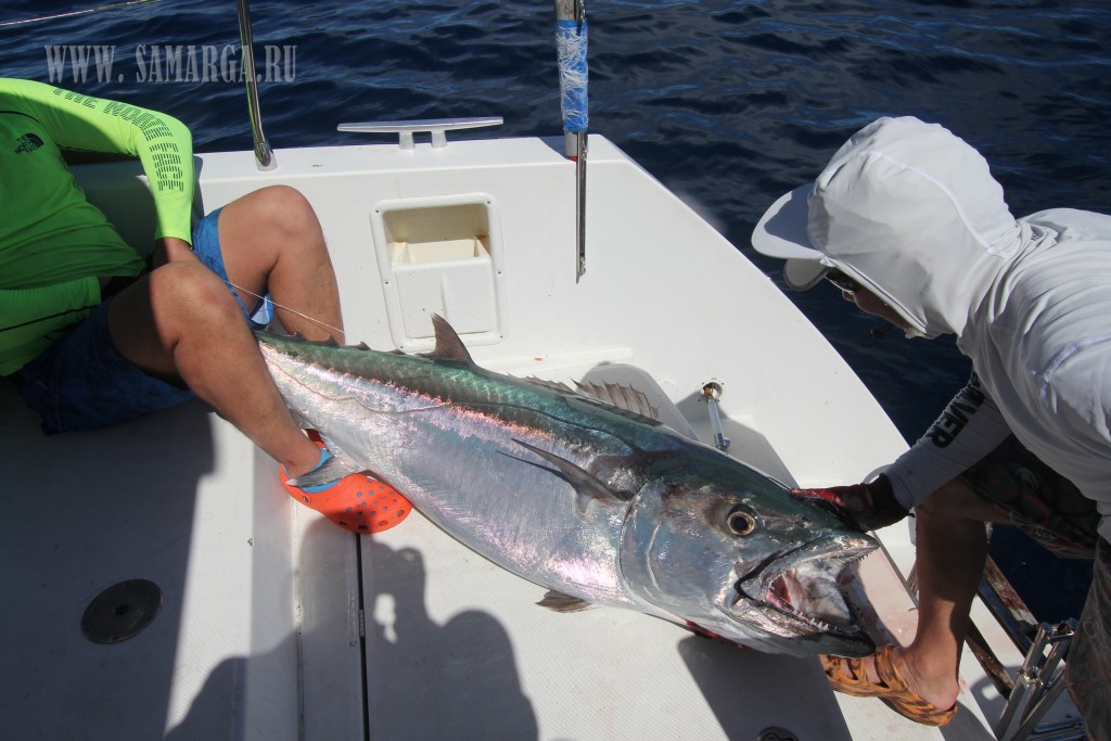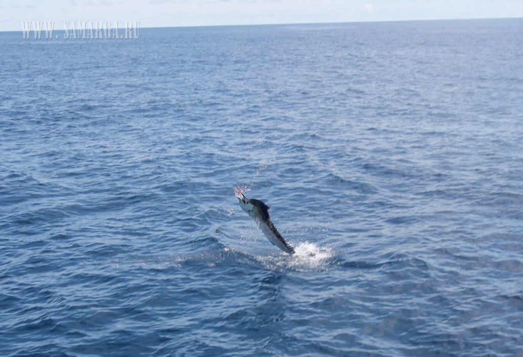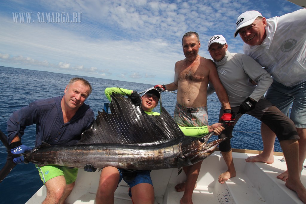 А дальше как в сказке. Второй или третий заброс и вдруг из неоткуда темная тень и атака, промах, опять атака уже недалеко от ката я отчетливо определяю формы SailFish ( парусник ), но адреналин заставляет сделать еще одну ошибку. Подсекаю не дождавшись пока рыба перехватит Поппер и соответственно вырываю приманку изо рта. Повезло, что в последний момент перед тем, как рыба уходит на глубину, замечаю направление ее движения. Делаю заброс в этом направлении, так сказать, на опережение, первый джерк и вот она атака. Беру верх над эмоциями и просекаю в нужный момент. Есть! Рыба на крючке. Но радоваться рано. Такой трофей так просто не сдается. Парусник резко уходит на глубину, сматывая десятки метров шнура и загибая спиннинг (в бараний рог). Признаюсь, это мой первый парусник, пойманный в кастинг, хотя ранее уже имел поклевки в троллинг и джиг. Поэтому в принципе понимал, как будет вести себя рыба. Нырнув на глубину он обязательно постарается освободится от приманки резко поняв направление движения стремясь к поверхности, затем вылетает из воды мотыляя головой в стороны, пытаясь избавиться от приманки. Так повторяется пока не устанет или не сорвется с крючка. В этот раз исключений не было. Рыба сделала пять или шесть прыжков и свечек, в такой момент очень важно быстро подбирать шнур, не давая слабины и стараться смягчать рывки. Все это происходит очень стремительно. Хотя ребята услышав мою суету успевают выбежать на палубу и запечатлить несколько кадров. Рыба сдается, я быстро вывожу ее на корму. Там ребята уже готовы принять трофей. Несомненно, мы сохраним рыбу, поэтому достаем его только руками (обязательно в перчатках ), зафиксировав нос (это очень важно ) во избежание травм освобождаем от приманки, очень быстрая фотосесия и отпускаем рыбу. Все было сделано так слаженно и быстро, что рыба даже не поняла, что это было и оказавшись в воде моментально рванула на глубину. Трофей около 2,5 метров в длину и на глаз около 40 кг. Принимаю поздравления от друзей, которые уже все вооруженные спиннингами выстреливают свои приманки в надеже испытать такие же чувства.