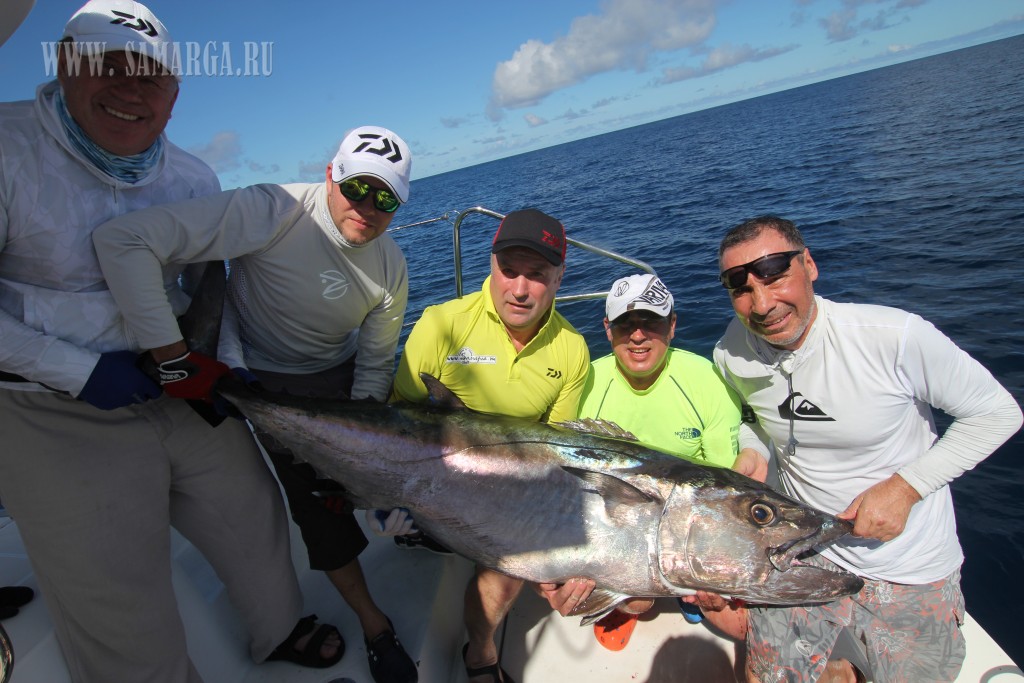 Адреналиновый всплеск быстро проходит, тем более, все понимают, что такой "жор" может закончится в любой момент. Поэтому не теряя ни минуты опять заходим на точку , почти синхронно сбрасываем джиги в воду, каждый мечтает о такой поклевке . Джигуют все как "боги". Жаль, что не было оператора заснять этот "ткацкий станок ". В воздухе подвисает безмолвный вопрос, кто следующий счастливчик? Поклевки продолжаются - догтусы, амберджеки, групперы, но это все не то, 10-15 кг уже не кого бодрят, каждый мечтает о трофее. Тут БАХ !!! Следующую дозу Адреналина получаю Я! Поклевка из разряда 50+++ Мощнейший спиннинг в дугу, мелодичный треск фрикциона и десятки метров сбегающего шнура увеличивают выброс адреналина в кровь. Вот она, Рыба Моей Мечты! Усилие на спиннинг только увеличивается, прошло уже несколько минут, а я до сих пор не могу остановить рыбу, она плавно продолжает снимать шнур и на шпуле его остается все меньше. В голове вес воображаемого трофея увеличивается с каждой минутой борьбы, и вот уже 70+ , 80+, 90+ .