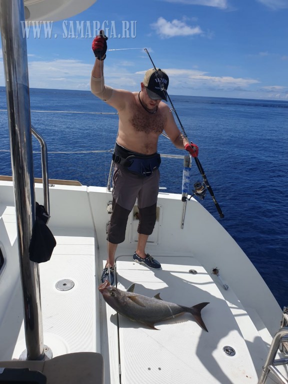 Поклевка случилась у Сергея К. уже по первым секундам после поклевки понятно, что соперник на другом конце лески очень достойный. Я быстро выматываю свою снасть, дабы не помешать вываживанию. Ребята делают тоже самое. Сергей остается один на один с трофеем. Даже с катушки с прилично зажатым фрикционом рыбе легко удается сматывать плетенку, при этом оказывая сильное давление на спиннинг и тут у рыбака подклинивает спину и немного паникуя он просит помочь ему и передает спиннинг Андрею З. , Андрей конечно достаточно опытный рыбак и шансов у рыбы практически не остается. Четкая и правильная техника Андрея и уже через 10-11 минут из морских глубин виднеется очертания монстра. Солидный Доги больше полутора метров в длину уже на поверхности, мы дружно поднимаем его на борт. Это настоящий трофей Экспедиции Сейшелы 2018. На вид вес 70-80 кг длиной 165см. Поздравляем Андрея, снимаем рыбу с крючка и пытаемся быстро реанимировать и отпустить её .