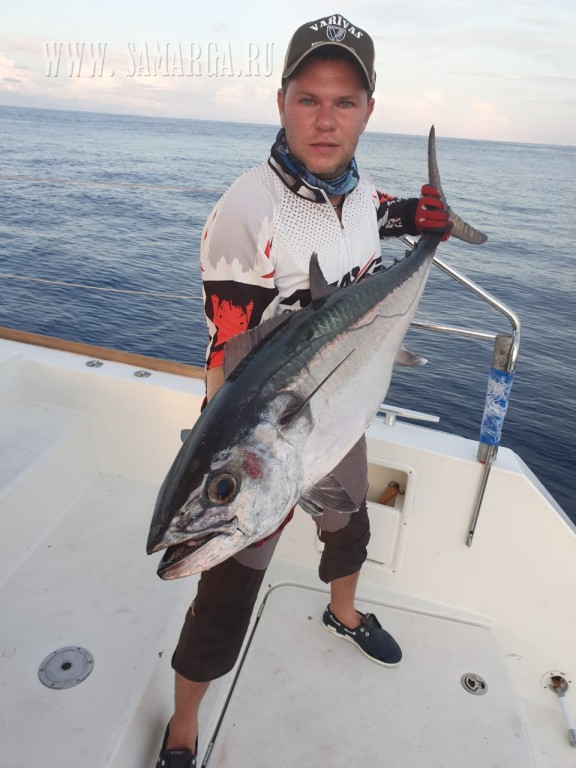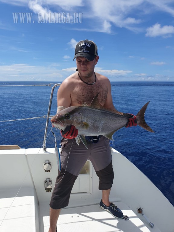 Уже около 8 утра на судне был техник который без лишних разговоров взялся за дело и уже к 12 часам все проблемы с оборудованием были устранены и мы через заправку двинулись на Юг банка Plate .Ходу туда часов 9 , по ходу берем нескольких тунчиков из под корма .Пришли на место опять же по темну, поужинали и спать в надежде встать с рассветом и закипятить воду своими поперами . Проснулись как и планировали с первыми лучами солнца , утреннее кофе и в бой . Идем по фарватеру банки , со слов капитана две недели назад здесь всё кишило кормом, огромные поля фузилеры (кормовая рыба) и поклевки были практически на каждом забросе, но как говорится клева было вчера, а сегодня просто мертвое море несколько часов тишины из поклевок только несколько некрупных рифовых акул. Да уж вот такая утрянка, ничего бывает .Выйдя за остров решили сменить тактику, кастинг в сторону беремся за джигинг тем более место очень перспективное, хороший свал с балконами и гребнями . Мы не ошиблись попали в десятку, рыба как будто ждала наши джиги и жадно стала их хватать . Догтусы, догтусы, догтусы, груперы джобы и снова догтусы. Условия идеальные глубина , практически отсутствия сноса , штиль клюет у всех, но вот слышится характерные звуки которые как правило сопровождают мощную томную поклевку .