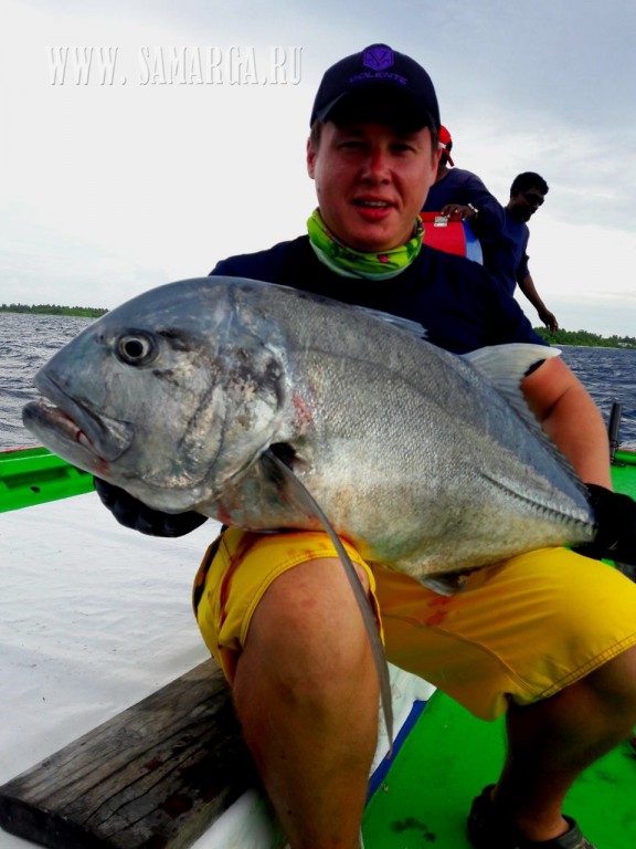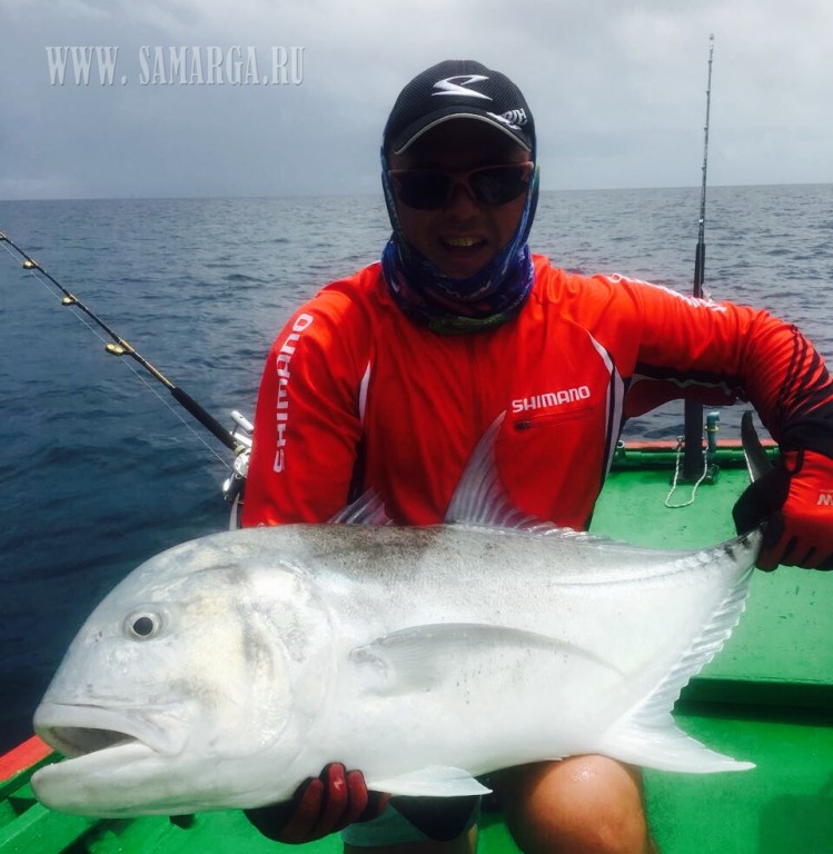 Пройдя около 40 минут, капитан подошел к первому атоллу, прозрачность воды просто завораживает, погода безветренная, полный штиль. (Погода не для рыбалки, а для отдыха), делаю несколько забросов Поппером Halco (цвет зеленый), молодь разбегается в стороны, выходов хищника нет. Сменив несколько мест, Алексей с верхней палубы судна делает хороший заброс и его стик (Shimano 160 F) четко попадает на линию свала. Из вне «вылетает» GT (Giant Trevally) и атакует приманку, началась борьба, примерно 10-15 минут борьбы, визга фрикциона и криков Алексея. И вот она! Первая наша рыба на борту. GT хорошего размера около 25 кг. Фотосессия с трофеем. К огромному сожалению, из-за того что рыба очень глубоко заглотила приманку и повредила себя, спасти ее не удалось, как мы не старались. После нескольких забросов у меня садится на стик (Shimano OCEA PENCIL 220 F), который был куплен в крайней поездке в Японию. GT не крупный (голубой) около 5-7 кг. У двоих наших ребят пока не получается взять рыбу. Через некоторое время у Натальи на стик M&W (розовый-серебро) вышел Желтоперый Тунец около 1 метра длиной, сопроводил его до лодки, но не атаковал. Не хватило опыта (по проводке). После этого я также на (Shimano 220 F) взял еще два GT весом около 10 кг. К 12 часам перекусили и снова в «бой». Делаю хороший заброс, точно попадаю на грань свала, проводка и вот она, атака GT хорошего размера. Просекаю, по фрикциону (настроенного примерно на 15 кг.) понимаю, что на том конце достойная рыба. После отработки фрикциона, вымотав около 50 м. рыба встала как плита, не уходит и не поддается на поверхность. Удерживая рыбу пару минут она стала уходить на глубину, вымотав еще около 20 м.