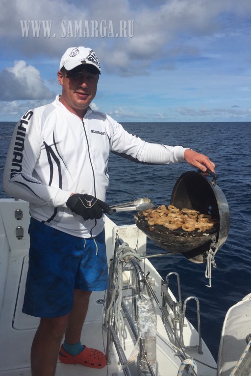 Уже за полночь мы приходим на место якорной стоянки на край Ower bank. Те, кому удалось поспать на переходе, уже готовы замочить снасти. Установили прожектор на корму, яркий свет быстро собирает планктон и мелкую кормовую рыбу вокруг. На границу светового пятна подтягиваются каракатицы и мелкие хищники, в основном не крупная баракуда, она нас интересует меньше всего, а вот королевская каракатица наш клиент! Каракатица хорошо клюет на кастинговые кальмарницы, светонакопительные и медленно тонущие. Сейшельская рыбалка началась. Размер с доброго дальневосточного кальмара, вот только чернил гораздо больше. В общем, к первым лучам солнца корма нашего белоснежного лайнера была здорово ухезана. С рассветом уже вся команда была в строю. Не считая каракатиц и ночных баракуд, счет открыл Валерий Б. За несколько минут он поднял на борт несколько очень ярких и красивых Дорад. Счет открыт! Еще несколько догтусов на кастинг порадовали наших рыбаков, размер не крупный 12-15 кг, на джиг амбержеки и елоуфины (желтоперый тунец). Утрянка закончилась и мы в поисках перспективных мест отправляемся по просторам Индийского океана. На обед решили приготовить свежайший улов на гриле.