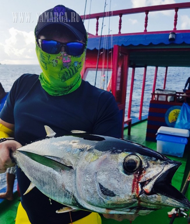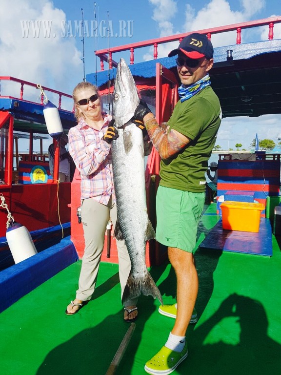 Пройдя около 40 минут, капитан подошел к первому атоллу, прозрачность воды просто завораживает, погода безветренная, полный штиль. (Погода не для рыбалки, а для отдыха), делаю несколько забросов Поппером Halco (цвет зеленый), молодь разбегается в стороны, выходов хищника нет. Сменив несколько мест, Алексей с верхней палубы судна делает хороший заброс и его стик (Shimano 160 F) четко попадает на линию свала. Из вне «вылетает» GT (Giant Trevally) и атакует приманку, началась борьба, примерно 10-15 минут борьбы, визга фрикциона и криков Алексея. И вот она! Первая наша рыба на борту. GT хорошего размера около 25 кг. Фотосессия с трофеем. К огромному сожалению, из-за того что рыба очень глубоко заглотила приманку и повредила себя, спасти ее не удалось, как мы не старались. После нескольких забросов у меня садится на стик (Shimano OCEA PENCIL 220 F), который был куплен в крайней поездке в Японию. GT не крупный (голубой) около 5-7 кг. У двоих наших ребят пока не получается взять рыбу. Через некоторое время у Натальи на стик M&W (розовый-серебро) вышел Желтоперый Тунец около 1 метра длиной, сопроводил его до лодки, но не атаковал. Не хватило опыта (по проводке). После этого я также на (Shimano 220 F) взял еще два GT весом около 10 кг. К 12 часам перекусили и снова в «бой». Делаю хороший заброс, точно попадаю на грань свала, проводка и вот она, атака GT хорошего размера. Просекаю, по фрикциону (настроенного примерно на 15 кг.) понимаю, что на том конце достойная рыба. После отработки фрикциона, вымотав около 50 м. рыба встала как плита, не уходит и не поддается на поверхность. Удерживая рыбу пару минут она стала уходить на глубину, вымотав еще около 20 м.